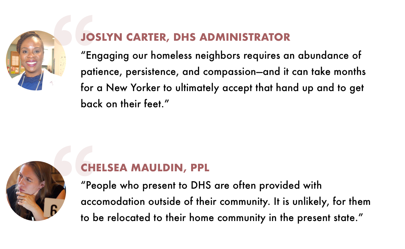 • As a team we’ve walked the streets of NYC, connected with service users, policy designers, care providers, etc. and lobbied officials in NYC Department of Homeless Services.