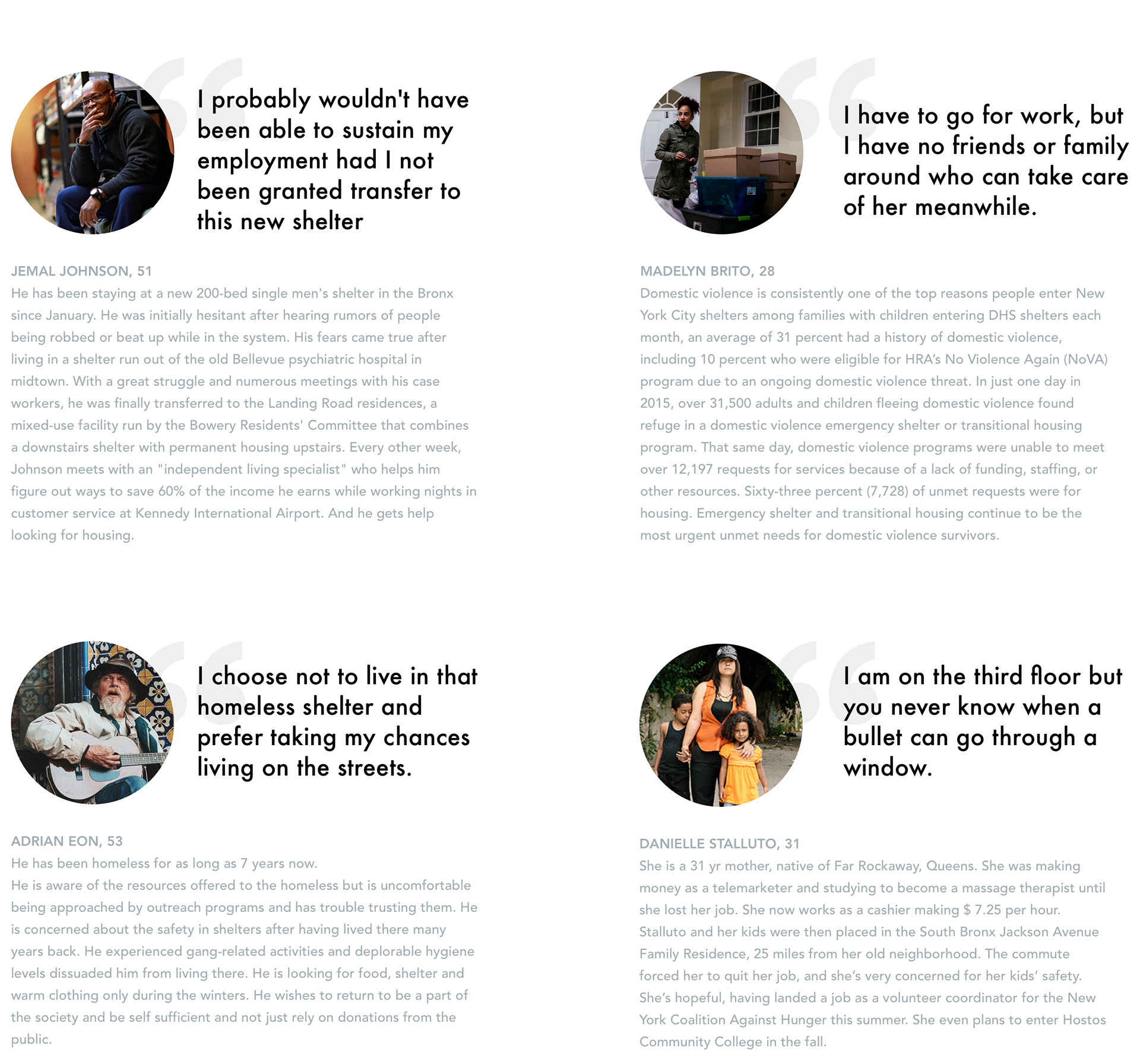 From 1994 to 2014, the Department of Homeless Services (DHS) shelter census skyrocketed 115%. At the same time, the city lost hundreds of thousands of affordable or rent-stabilized units. NYC Homeless services are massively over capacity. People who become homeless are placed in shelters without much regard for what/where is best for them.