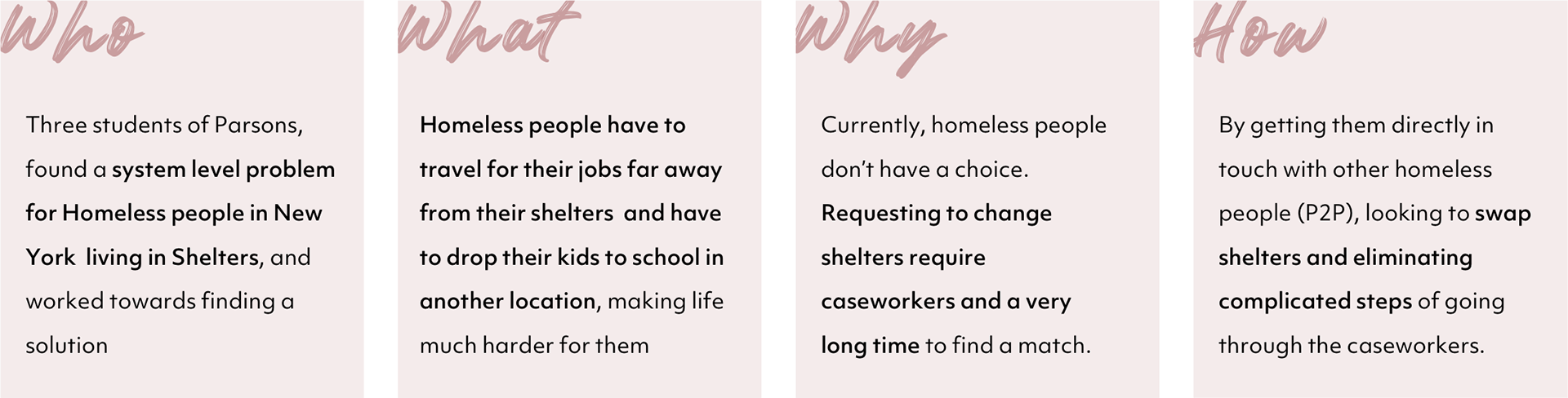In our class of Managing Creative Projects (MS Strategic Design and Management, The New School), John, Kruthika, and I were sitting next to each other in the first class and we were asked to work together in a team. The task was to walk around the city and think of problems people face in New York. Out of multiple problems, "Homeless people" struck us hard and we started our project as a team.